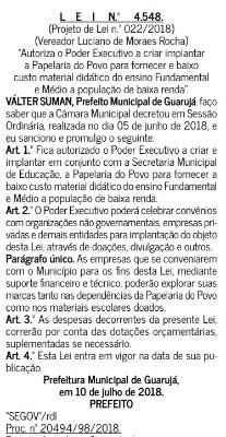 Foi sancionada pelo prefeito Válter Suman (PSB) a Lei Municipal 4.548, originária do Projeto de Lei 022/2018, de autoria do vereador Luciano Tody (MDB), que prevê criação de um centro de arrecadação e distribuição de materiais didáticos voltado a alunos de baixa renda.